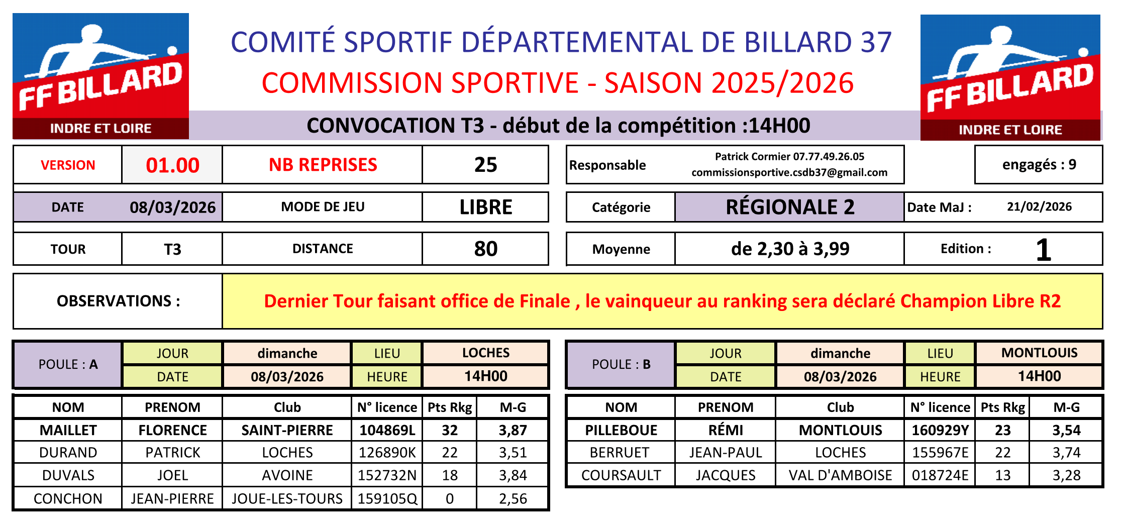 * Le classement final se fera au ranking de ce dernier tour, le 1er au ranking sera déclaré Champion du CSDB 37 à Libre R2 pour la saison 2025/2026.