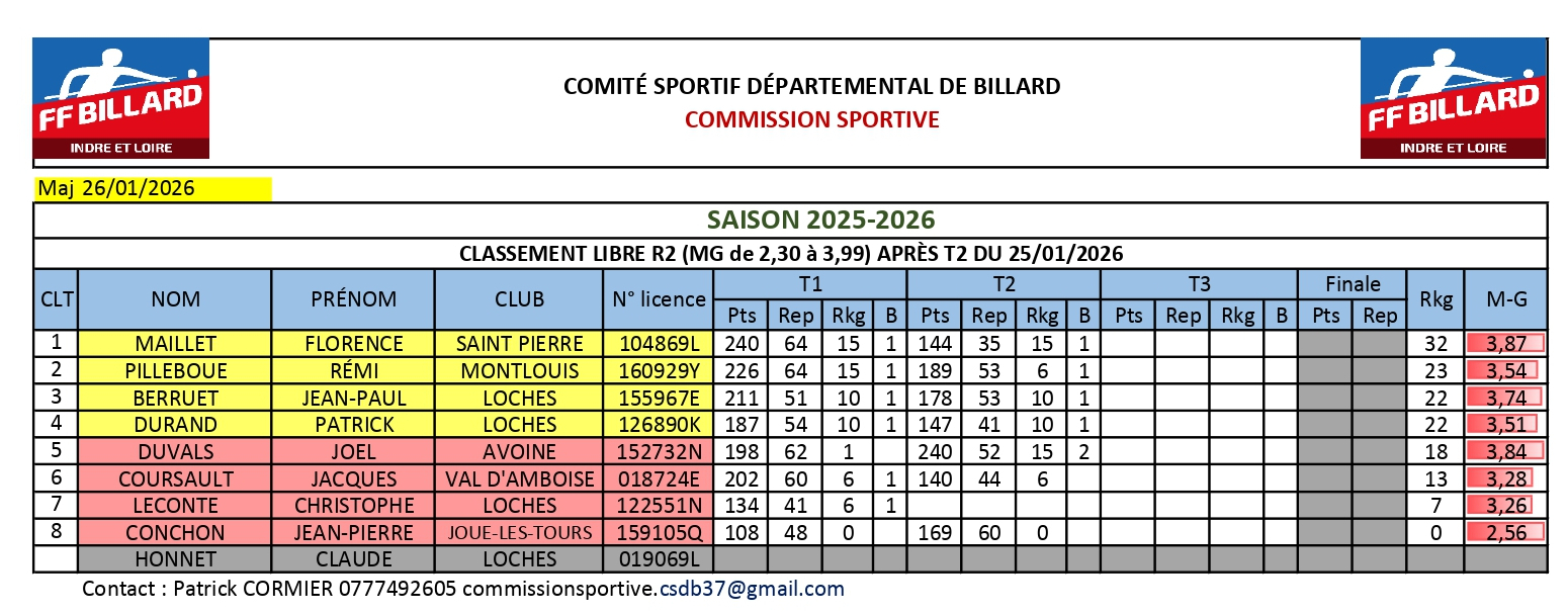 Le classement final se fera donc au ranking du T3, le 1ᵉʳ au ranking sera déclaré Champion Libre R2 pour la saison 2025/2026.