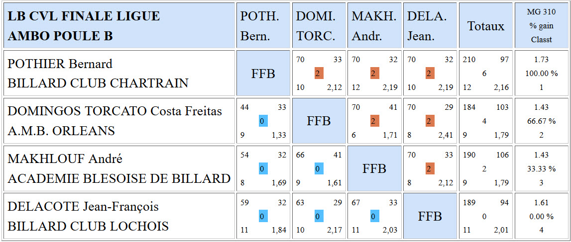 Dans la poule A, Alfredo se classe second à la moyenne avec une victoire et 1.87 de moyenne. Dans la Poule B, Jean-François termine 4e avec trois défaites et 2.01 de moyenne. Dans le matchs de classement (3e/4e places), Alfredo gagne et termine troisième de cette finale de ligue. Quant à Jean-François, il perd son le match de classement (7e/8e places).