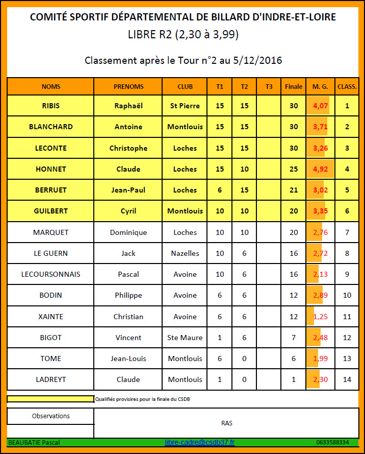 Antoine BLANCHARD de Montlouis-sur-Loire s'impose avec trois victoires (dont deux sur le fil 100/99 et 100/97) et 3.66 de moyenne, second Xavier BALLON d'Angerville avec deux victoires et 4.62, troisième Jacky BOURDEAU de Salbris avec 3.21 et quatrième Bruno MUNGUIA de Saint-Denis-en-Val avec 3.38.