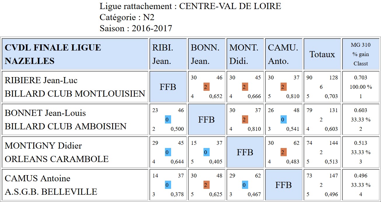 Visualisez ci-dessous le classement 2016/2017 du 3 Bandes N2 de la LBCVL avant les 1/2 finales.