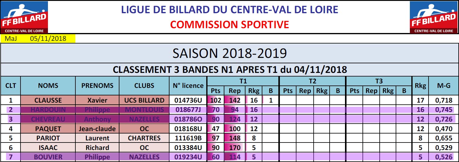 Visualisez ci-dessous le classement de la LBCVL saison 2018/2019 du 3 Bandes N1.