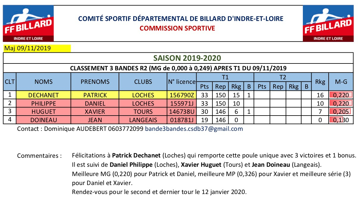 Classement final à l'issue de ce tour n°2 : En vertu de l'article 2‐14 du code sportif du CSDB 37 concernant la classification des joueurs nouveaux, Paul Dechanet (Loches) ayant à l'issue des 2 tours une moyenne générale dépassant le plafond de la catégorie, est exclu de cette compétition et intègre la catégorie R1 au 3 bandes. Les points de ranking acquis aux 2 tours lui sont retirés et bénéficient aux autres joueurs. Il peut s'il le souhaite participer au tour 3 du 3 bandes R1, mais sans aucun point de ranking.
