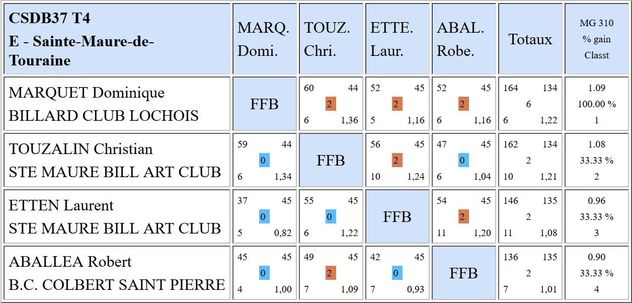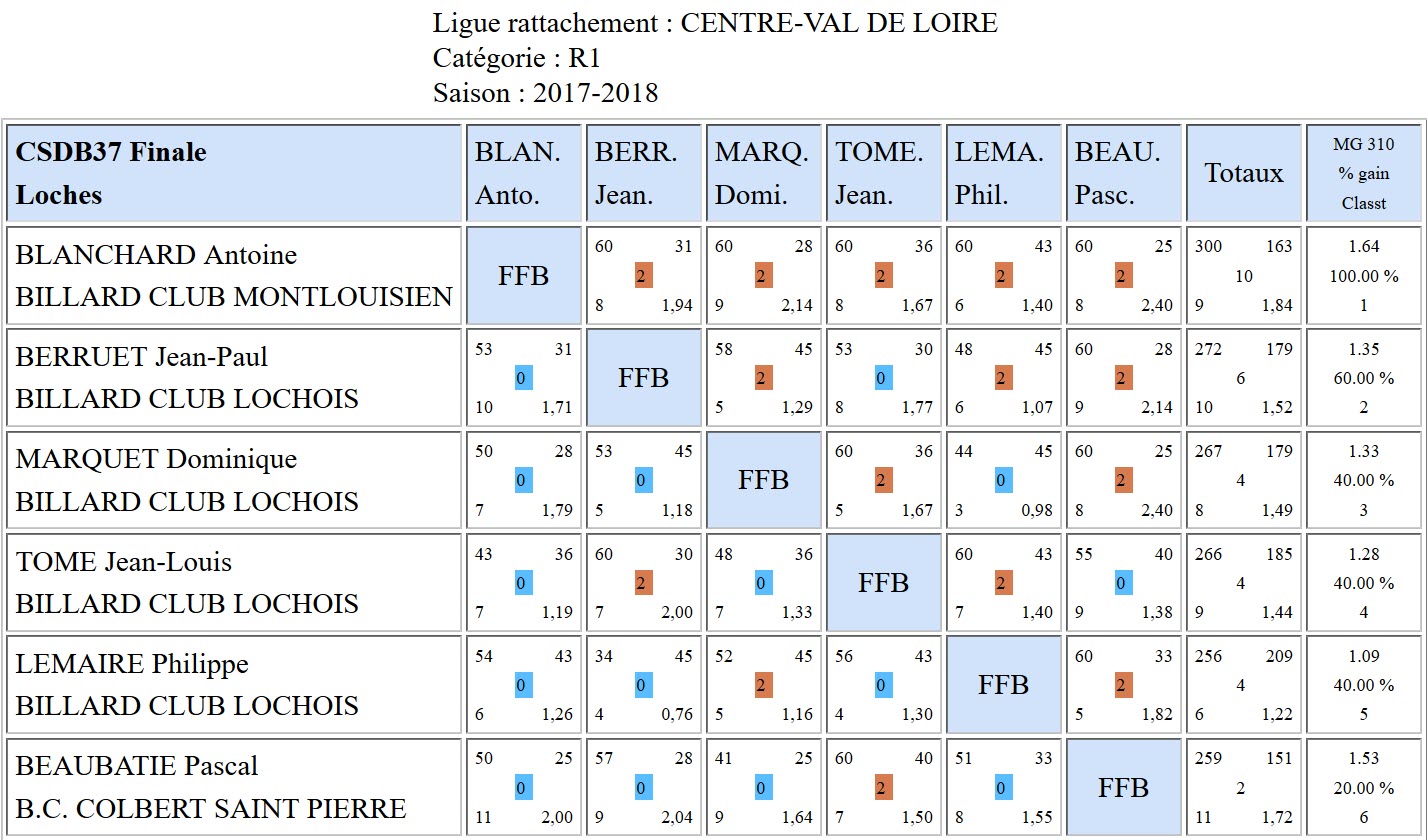 de Loches conserve la tête du ranking final avec 57 points et 1.50 de moyenne, second Antoine BLANCHART de Montlouis-sur-Loire avec 54 pts et 1.53, troisième Pascal BEAUBATIE de Satint-Pierre-des-Corps avec 52 pts et 2.21, quatrième Dominique MARQUET de Loches avec 52 pts et 1.46, cinquième Philippe LEMAIRE de Loches avec 40 pts et 1.16 et sixième (et dernier qualifié pour la finale) Jean-Louis TOME de Loches avec 49 pts et 1.38.