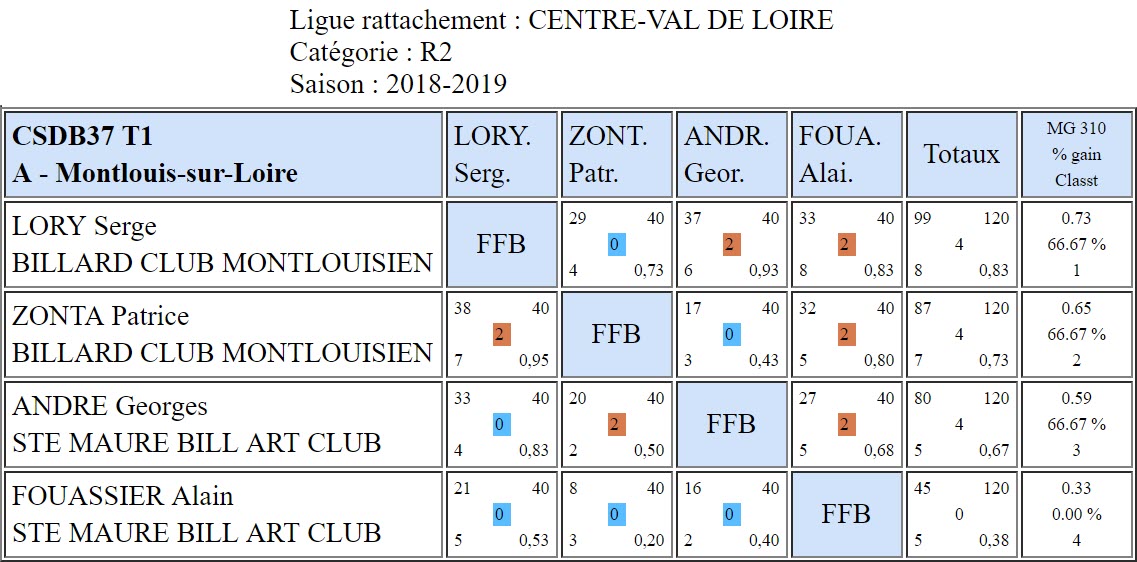 Les vainqueurs de poules => Poule A : Serge LORY de Montlouis-sur-Loire avec 0.83 | Poule B : Claude LADREYT de Montlouis-sur-Loire avec 0.75 | Poule C : Michel VAULOUP de Montlouis-sur-Loire avec 1.09 | Poule D : Jean-Marc DAVAILLON de Loches avec 0.96 | Poule E : William COURTOIS de Saint-Pierre-des-Corps avec 0.95.