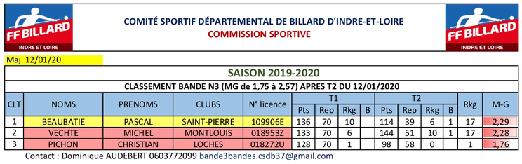 Bande Nationale 3 - Résultats du T2 du 12/01/20