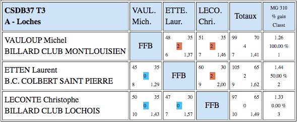 Poule A > Michel VAULOUP de Montlouis avec 1,41 | Poule B > Patrick DURAND de Loches avec 1,52 | Poule C > Philippe LEMAIRE de Loches avec 1,15 | Poule D >  Raphael RIBIS de St Pierre des Corps avec 1,69 | Poule E > Claude HONNET de Loches avec 1.75.