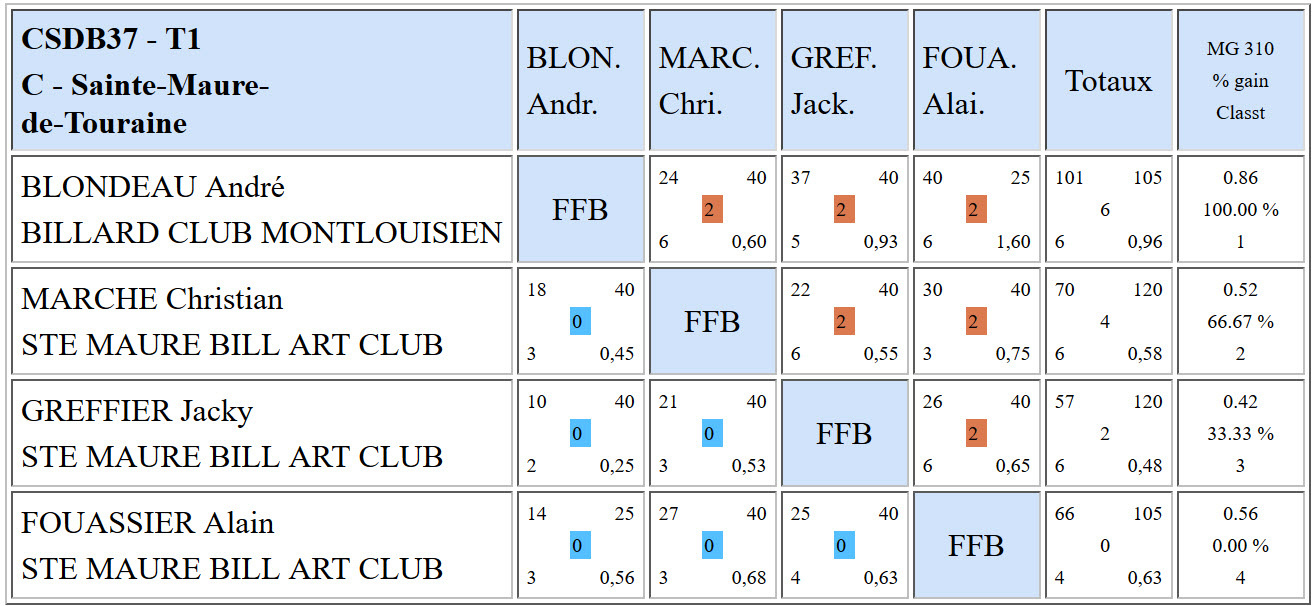 de Loches remporte le titre avec quatre victoires et une seule défaite et 1.08 de moyenne générale. A égalité de victoires avec Laurent, Jean-Noël GENET de Montlouis-sur-Loire doit se contenter de la seconde place avec 1.05 de moyenne. Luis CRUZ de Tours monte sur la troisième marche du podium.