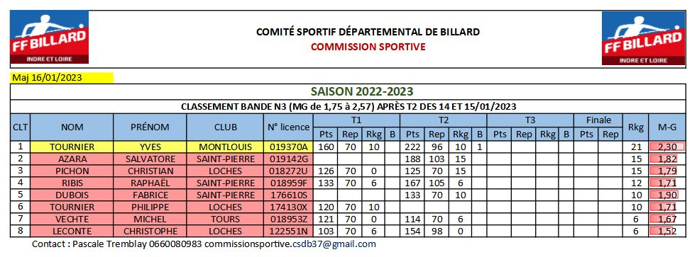 Yves Tournier (Montlouis) est  déclaré champion départemental à la BANDE N3 et il est qualifié pour la finale de ligue le 19 mars à Briare (45)