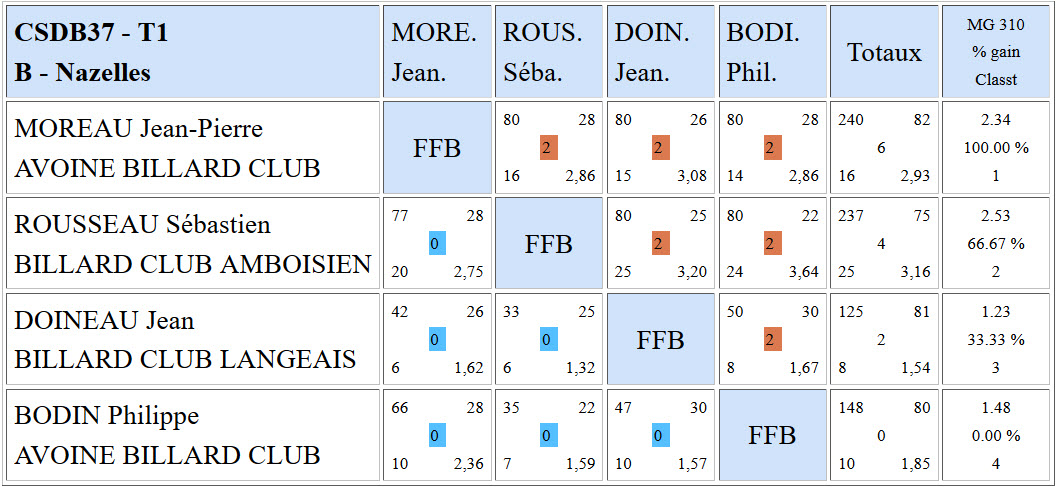 Antoine BLANCHARD de Montlouis-sur-Loire remporte le titre avec quatre victoires et 3.32 de moyenne, Joël DUVALS d'Avoine prend la seconde place avec 3.48 et Vincent BIGOT de Sainte-Maure-de-Touraine se classe troisième (à égalité de points de matchs) avec 3.21 .../... Voir la les résultats de la finale ci-après.