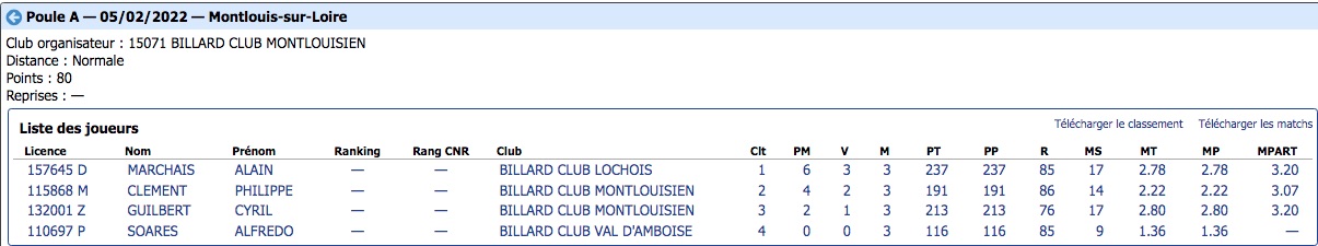C'est à la faveur de sa moyenne générale qu'il devance Philippe Clément (Montlouis). Cyril Guilbert (Montlouis) est 3e et Alfredo Soares (Val d'Amboise) 4e.