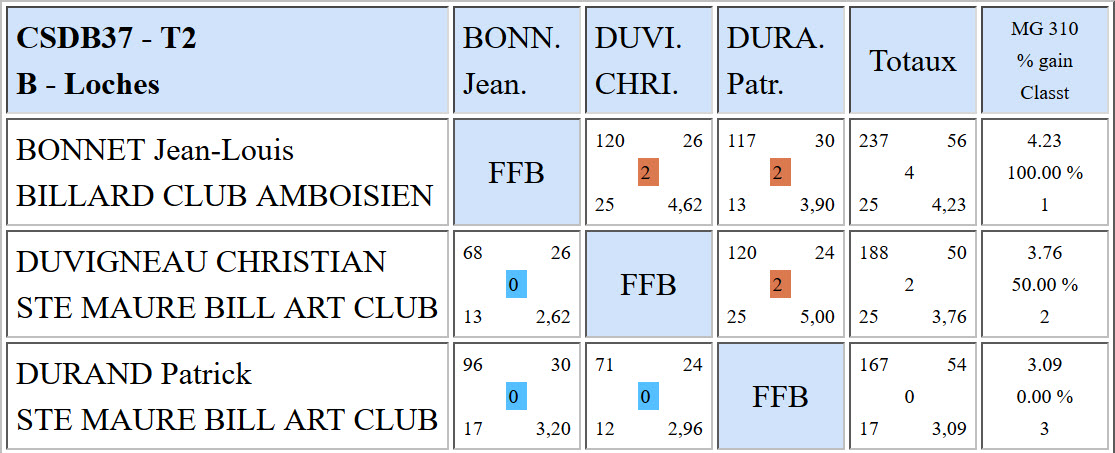 Trois joueurs à deux victoires et une défaite dans cette finale à suspens, c'est finalement Jean-Louis BONNET de Nazelles qui s'impose à la moyenne avec 4.85. Patrick DURAND de Sainte-Maure se classe second avec 4.32 et sur la troisième marche du podium, Christian PICHON de Loches avec 3.74. Avec trois défaites, Pascal BEAUBATIE de St Pierre termine quatrième avec 2.98.