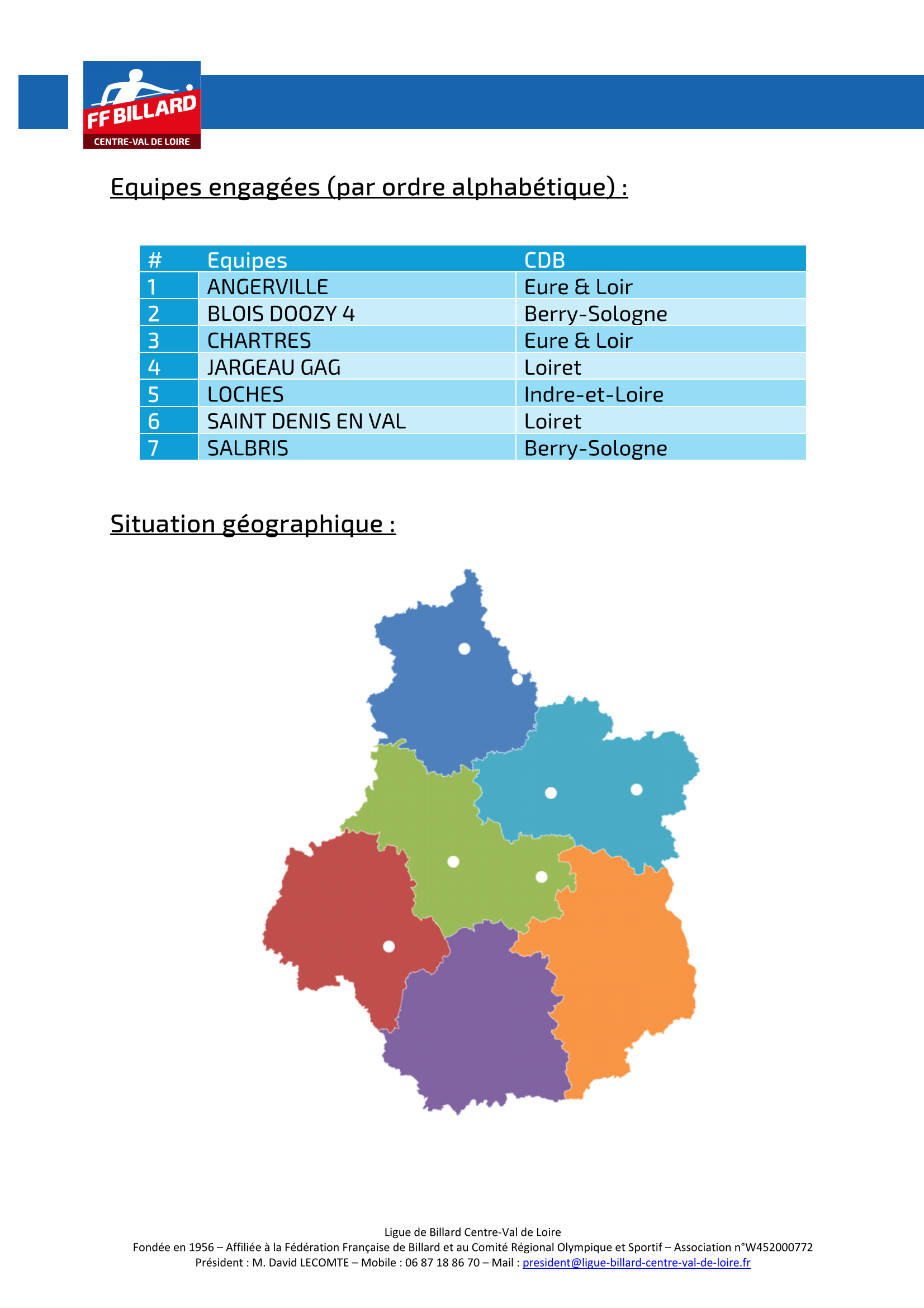 Sept équipes inscrites : ANGERVILLE - BLOIS DOOZY 4 - CHARTRES - JARGEAU GAG - LOCHES - SAINT-DENIS-EN-VAL - SALBRIS