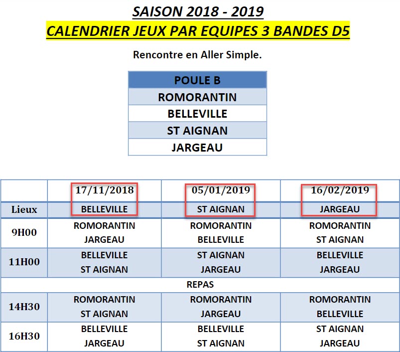 Visualisez et/ou téléchargez les calendriers du 3 Bandes D3, D4 et D5 saison 2018/2019 ci-dessous.