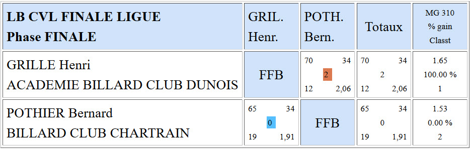 C'est Henri GRILLE de Châteaudun qui remporte la finale de ligue en s'imposant de justesse face à Bernard POTHIER de Chartres sur le score de 70 à 65 en 34.