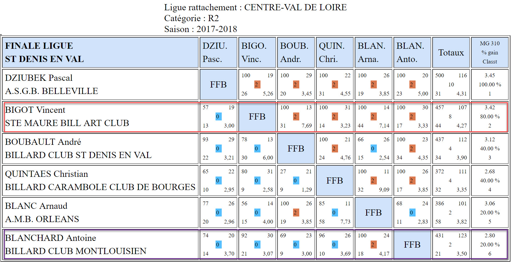 37 Libre R2 Finale du 25 02 18 PhotoAntoine BLANCHART remporte cette finale avec 3.48 de moyenne, second Vincent BIGOT de Sainte-Maure-de-Touraine avec une victoire, un nul et une défaite et 4.25, troisième Cyril GUILBERT de Montlouis-sur-Loire avec les mêmes résultyats que Vincent et 3.00, Jean-Louis TOME de Loches prend la quatrième place avec une seule victoire et deux défaites et 3.03.