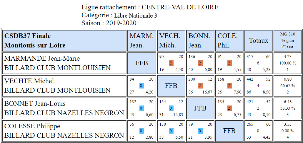 Jean-Marie MARMANDE de Montlouis-sur-Loire s'impose avec trois victoires et une moyenne de 5.28 - 2e Michel VECHTE de Montloluis-sur-Loire avec deux victoires et 8.50 - 3e Jean-Louis BONNET de Lussaut-sur-Loire avec 8.10 - 4e Philippe COLESSE de Lussault-sur-Loire avec 4.42.