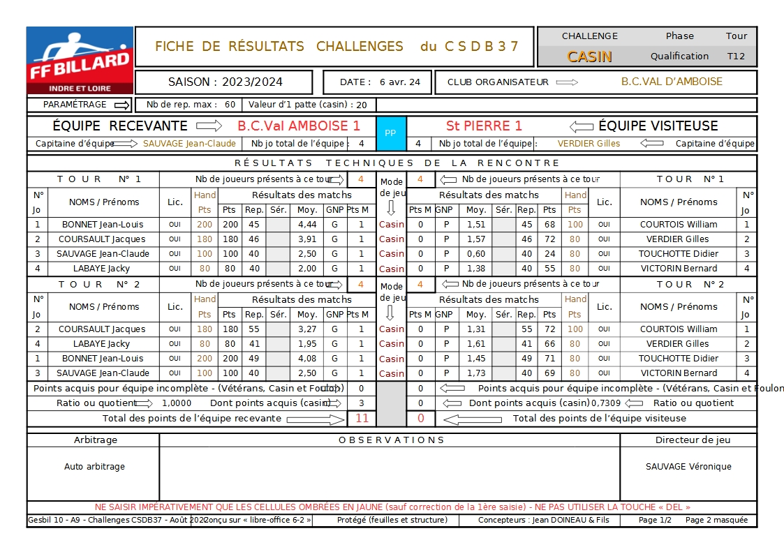 Les 1/2 Finales casin se sont déroulées le 23 Mai et les résultats donnent Loches et Amboise 1 qualifiés pour le principal et Joué et Langeais pour le complémentaire