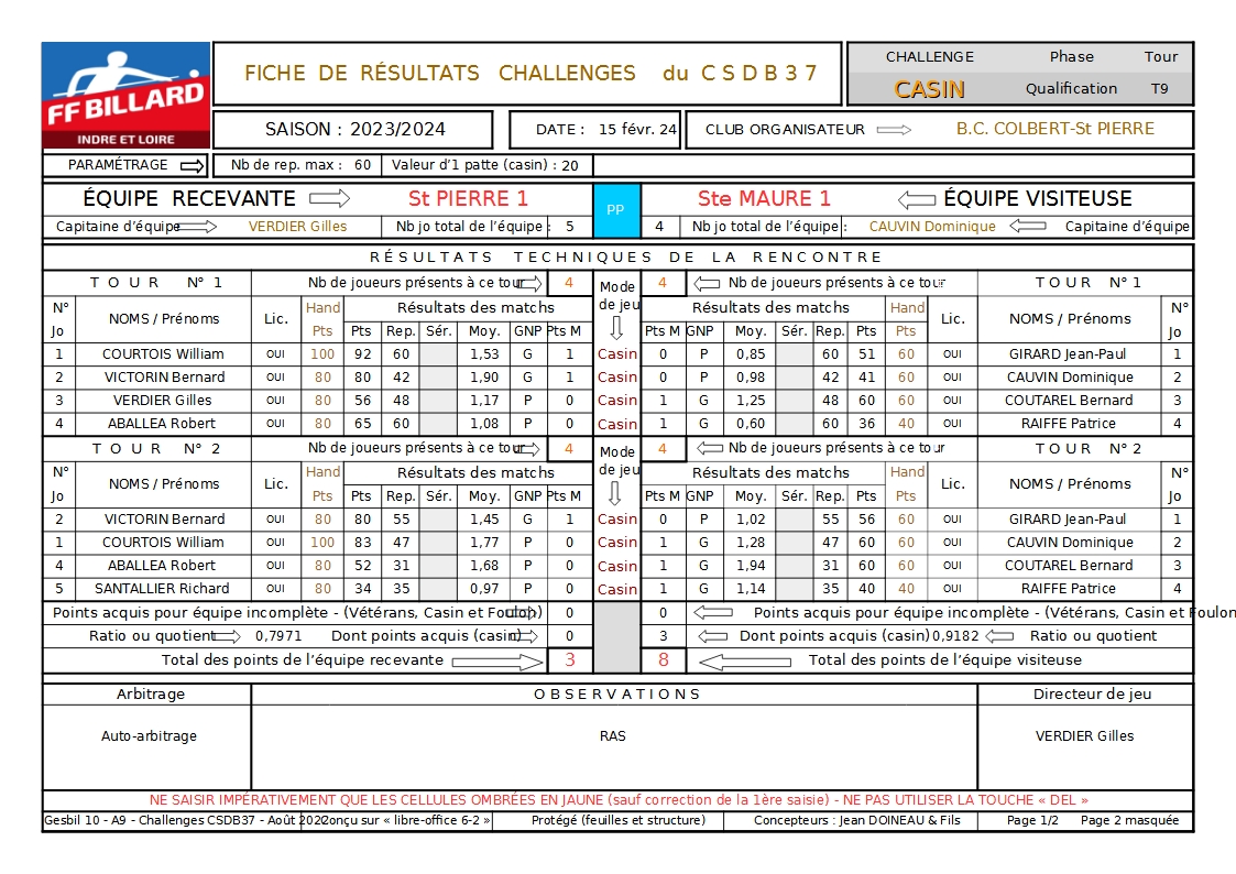Après T3 : Suite à l'analyse des moyennes des nouveaux joueurs il apparait que Bernard COUTAREL, Pascal ALPHONSE et Jacques COURSAULT ont dépassé le handicap demandé par leurs chefs d'équipes casin. En application du règlement Csdb37 leurs matchs joués sont perdus avec effet rétroactif. Par contre ils peuvent continuer à jouer avec de nouveaux handicaps, ceux-ci seront encore surveillés en cas de dépassement