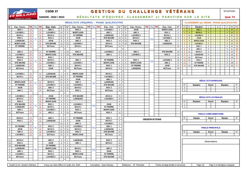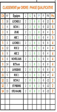 Classement (T1) : 1er Montlouis | 2e ROC 2 | 3e BCVA 1 | 4e Tours | 5e Loches 2 | 6e ABC 1. voir la suite ci-après.