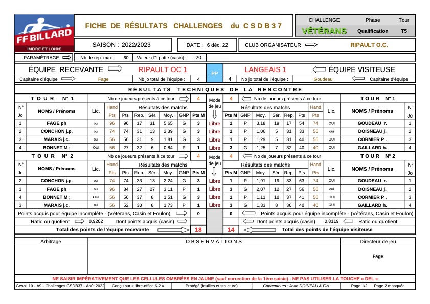 A la suite d'une erreur de saisie de la feuille de match ROC1/Joué ou les scores ont été inversés la feuille de classement s'en trouve modifiée.